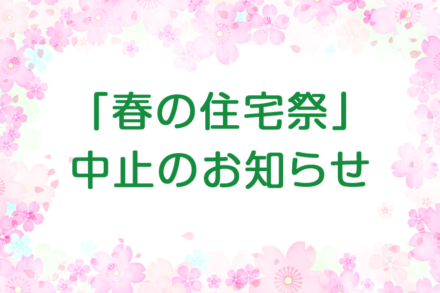 2020/02/29 EVENT 「春の住宅祭」 中止のお知らせ 新型コロナウイルスの感染が全国で拡大し、県内でも患者が発生したことから3/20(金祝)~22日(日)に予定していた「春の住宅祭」は、お客様の安全を確保するため、中止いたします。各出展メーカーのもでるハウスにつきましては、通常通り営業しております。ご迷惑をおかけしますが、ご理解をお願いします。