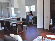 室内空間は、家族のコミュニケーションを深められるようなデザインが特徴です。センターダイニングの上に設けた吹き抜けから光が差し込み、LDK全体が明るくなっています。吹き抜けがあることで、「(室内の)どこにいても家族の存在を感じることができる」とご主人も満足されているそうです。