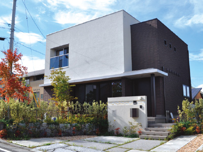 シンプルな四角いファサード(正面の外観)は、陰影の深い軒下空間の上に白い壁面を設けることで、「白壁が浮遊しているような家」に—。洗練された外観の さんの住宅はひときわ存在感を放ちます。