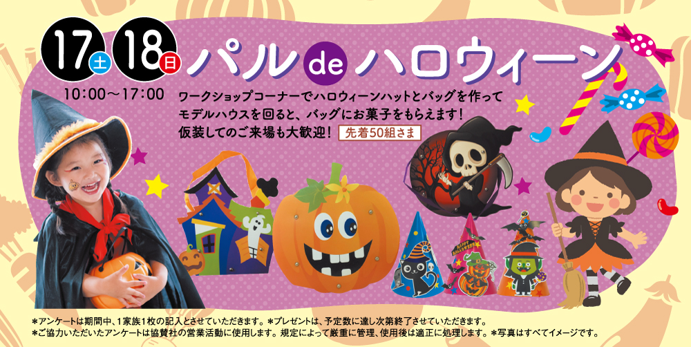 ワークショップコーナーでハロウィーンハットとバッグを作ってモデルハウスを回ると、バッグにお菓子をもらえます!仮装してのご来場も大歓迎!