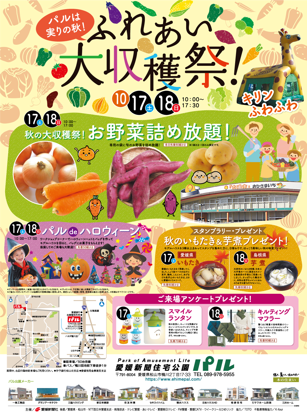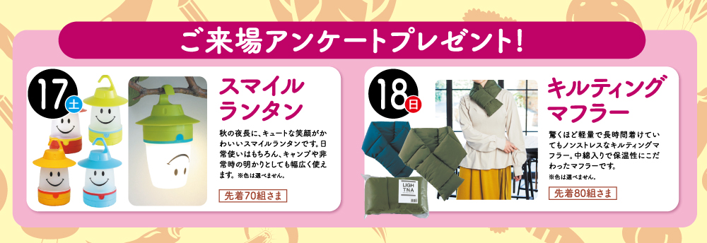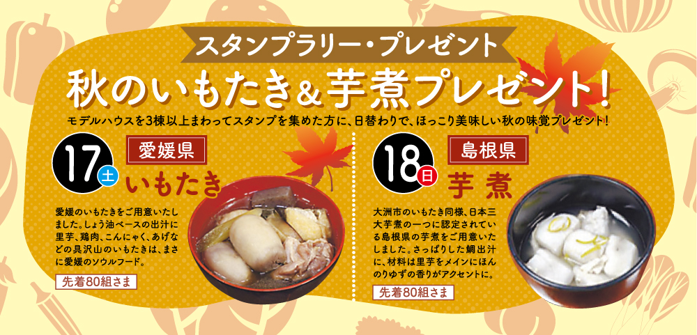 モデルハウスを3棟以上まわってスタンプを集めた方に、日替わりで、ほっこり美味しい秋の味覚プレゼント!