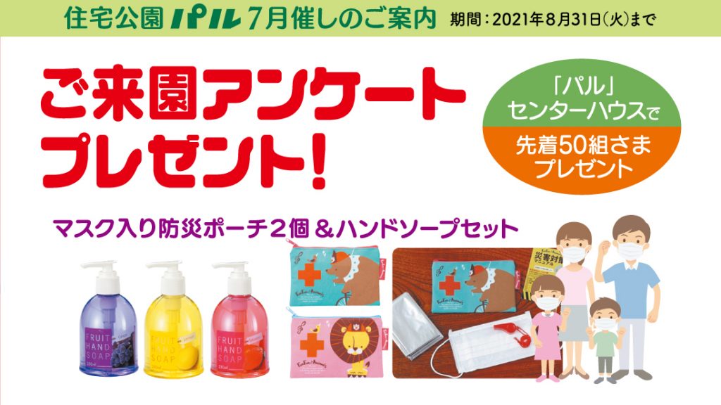 キャンペーン期間中に「パル」センターハウス「くらしの情報館」でアンケートにお答えいただいた方のなかから、先着50組さまに「マスク入り防災ポーチ&ハンドソープセット」をプレゼント!