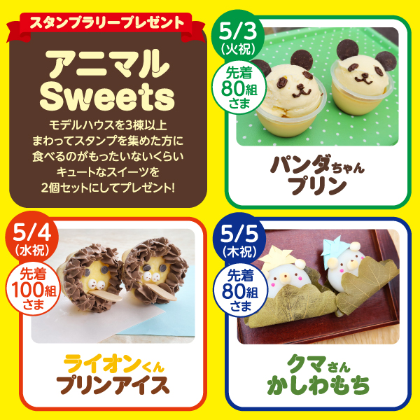 モデルハウスを3棟以上まわってスタンプを集めた方に食べるのがもったいないくらいキュートなスイーツを2個セットにしてプレゼント!